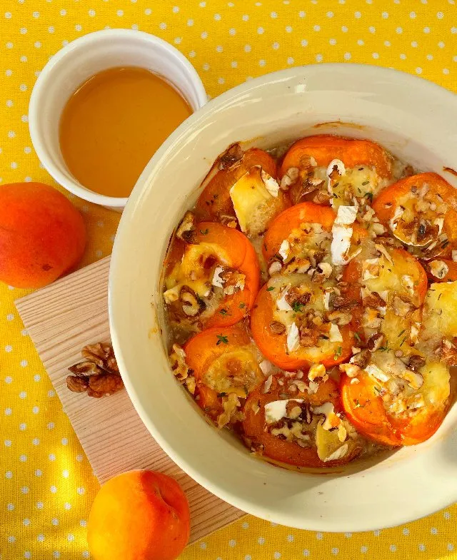 Backen Sie die Aprikosen, bis der Käse geschmolzen ist und die Nüsse goldbraun sind.