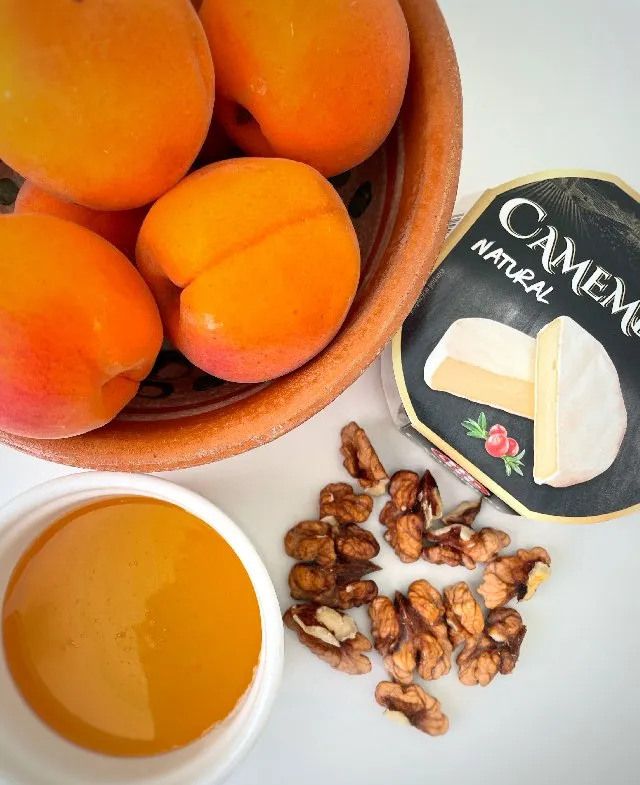 Die Zubereitung ist eigentlich ganz einfach. Heizen Sie den Backofen auf 180°C vor. Schneiden Sie die Aprikosen in Hälften und entfernen Sie die Steine. Legen Sie darauf Käsestückchen, bestreuen Sie sie mit gehackten Nüssen und träufeln Sie etwas Honig darüber.